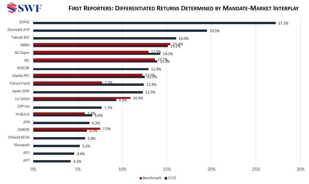 The first group of major sovereign wealth funds and public pension funds to report calendar year 2025 results shows that performance dispersion was primarily structural with high-equity savings funds such as Norges Bank Investment Management (NBIM), the New Zealand Superannuation Fund (NZSuper) and Korea Investment Corporation (KIC) clustered in the mid-teens. In contrast, diversified defined-benefit models such as Canada’s La Caisse and OMERS and the Swedish AP funds delivered lower returns. Stabilisation-oriented funds such as the State Oil Fund of Azerbaijan (SOFAZ) reported much higher headline outcomes, heavily influenced by revaluation effects. Where benchmarks were disclosed, excess returns were generally modest, with a small number of exceptions with a pattern indicating that allocation design and currency exposure mattered more than security selection.